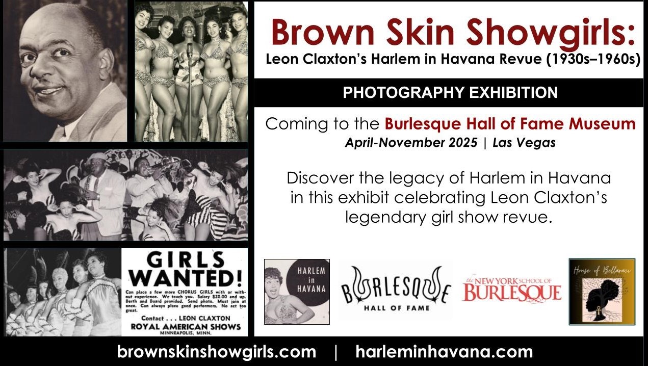 Brown Skin Showgirls opens at the Burlesque Hall of Fame on April 18, 2025, and will run through November, 2025. A special presentation will take place on Sunday, June 8, 2025, from 3:30 p.m. to 5 p.m. during the annualBurlesque Hall of Fame Weekender, featuring a conversation with Leslie Cunningham plus a special performance from brown skin showgirl Aquarius Moon. The exhibition and the special event will be included with the price of admission.