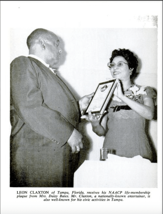 In the early 1960s, Leon Claxton received an NAACP Lifetime membership plaque for his civic activities in Tampa. Claxton was frequently covered in local newspapers such as the Tampa Tribune and Florida Sentinel Bulletin, which recognized his contributions to entertainment, civic life, and community leadership. His prominence in the press reinforced his reputation as a key figure in Tampa’s cultural and social history.